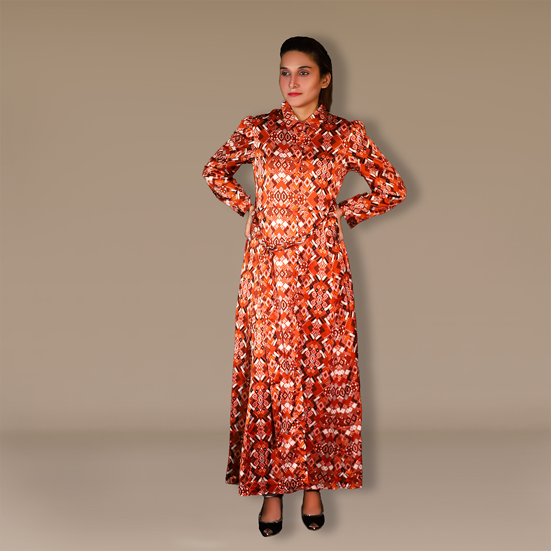 Presenting our "Tonal Elegance Symphony Dress" – a harmonious blend of colors and style. This dress features a captivating printed pattern adorned with multiple tones, creating a visual symphony of elegance. The stitched flair with the blouse adds dynamic movement to the ensemble. Cuffed long sleeves exude sophistication, while the collared neck and front button closure offer a timeless charm. The dress's long silhouette is gracefully cinched by a same-color printed front waist belt, enhancing the overall allure.