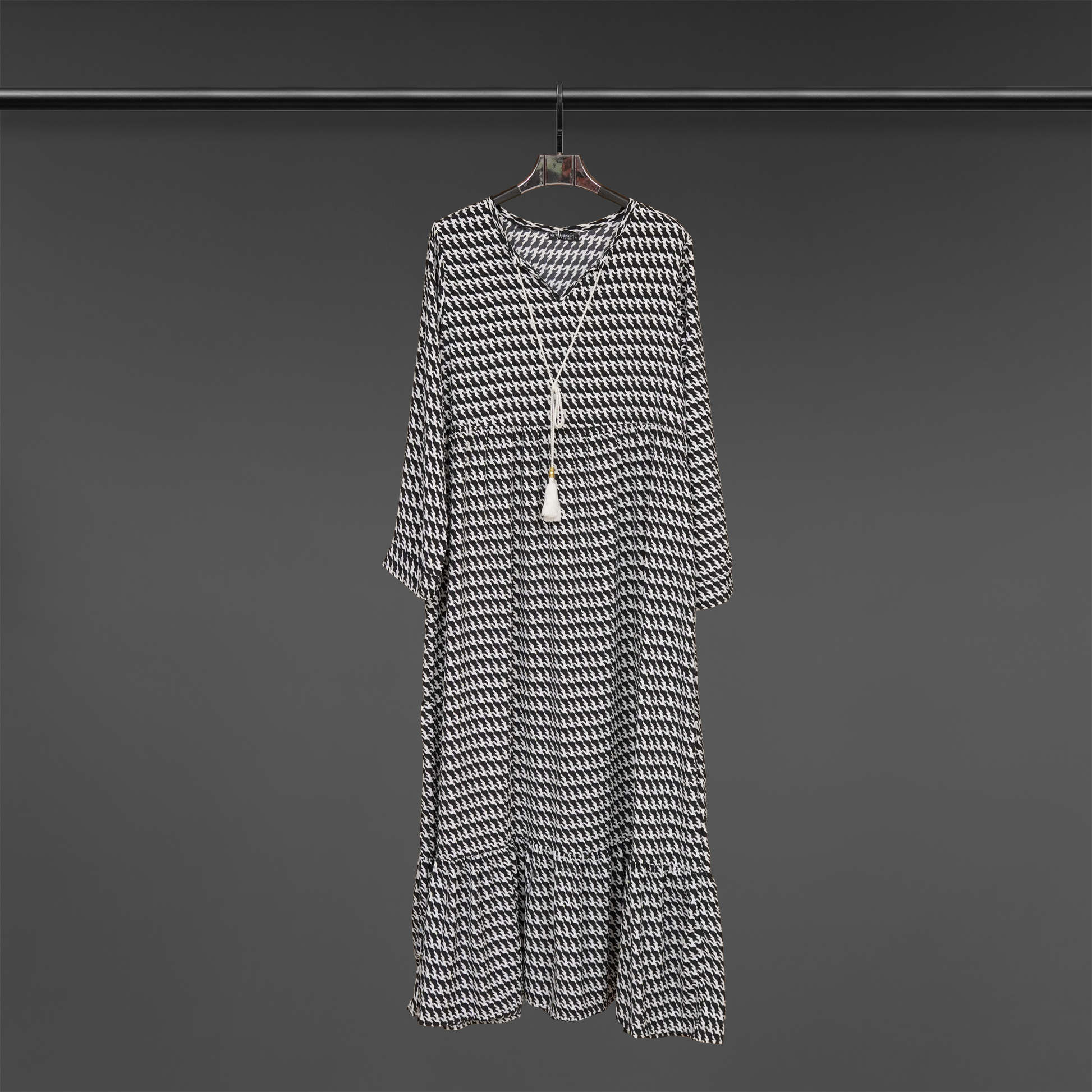 Presenting our "Pleated Elegance Fusion Dress" – a captivating blend of grace and style. This long dress features pleated flair down the chest, creating a visually striking design element. The tassel lace attached neckline adds a touch of charm and allure. The flared silhouette enhances your elegance, while the beautiful dual-color pattern exudes sophistication. Long sleeves add a timeless touch, making it suitable for various occasions.