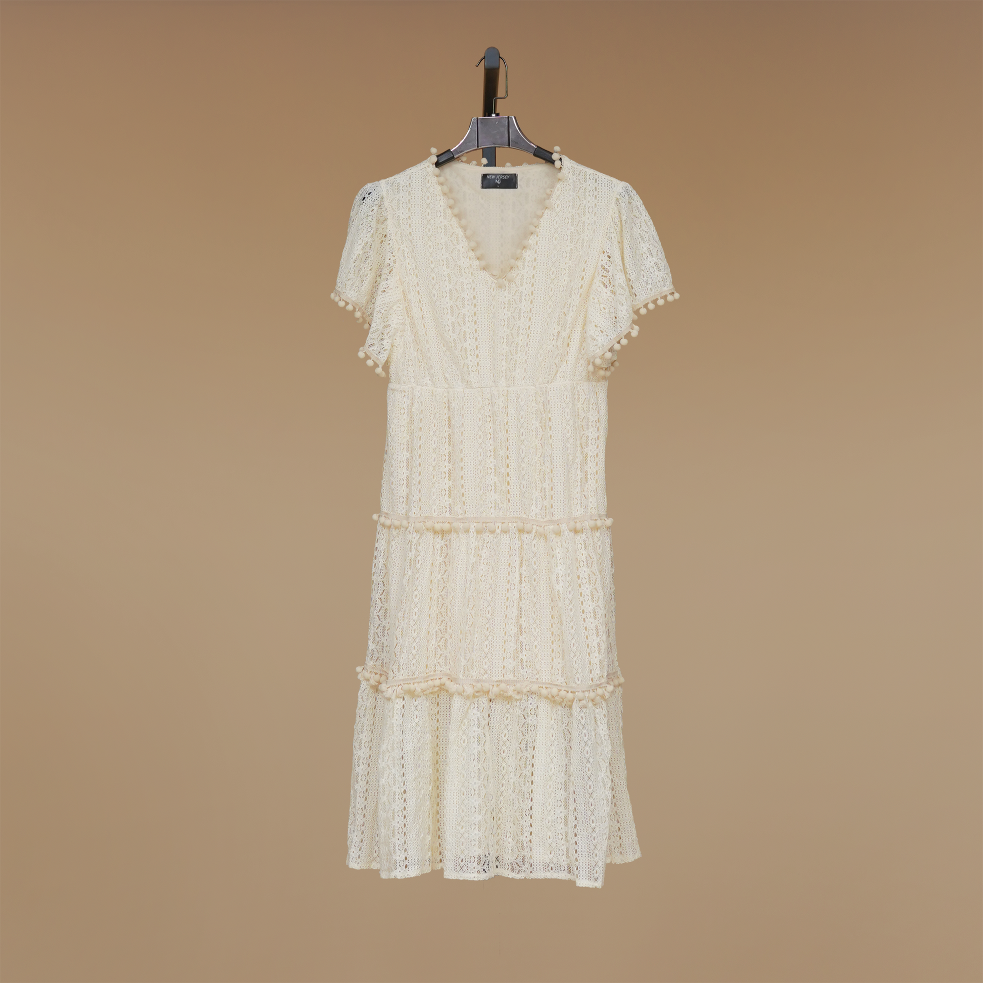 "Crochet Enchantment" Midi Dress - Embrace a mesmerizing blend of elegance and allure with this exquisite dress. The dress features a flattering V neckline, beautifully framing your neckline. Its midi length offers a sophisticated and versatile look suitable for various occasions. The shoulder-attached sleeves exude grace and poise. Embrace the enchanting three-stitched flairs that create a captivating and feminine silhouette, while the delicate ball-type lace adorns the sleeve ends and neckline, adding a touch of timeless charm. Crafted with intricate crochet detailing and a same-color stitched lining, our "Crochet Enchantment" Midi Dress is an exquisite addition to your wardrobe, radiating grace and style with every movement.