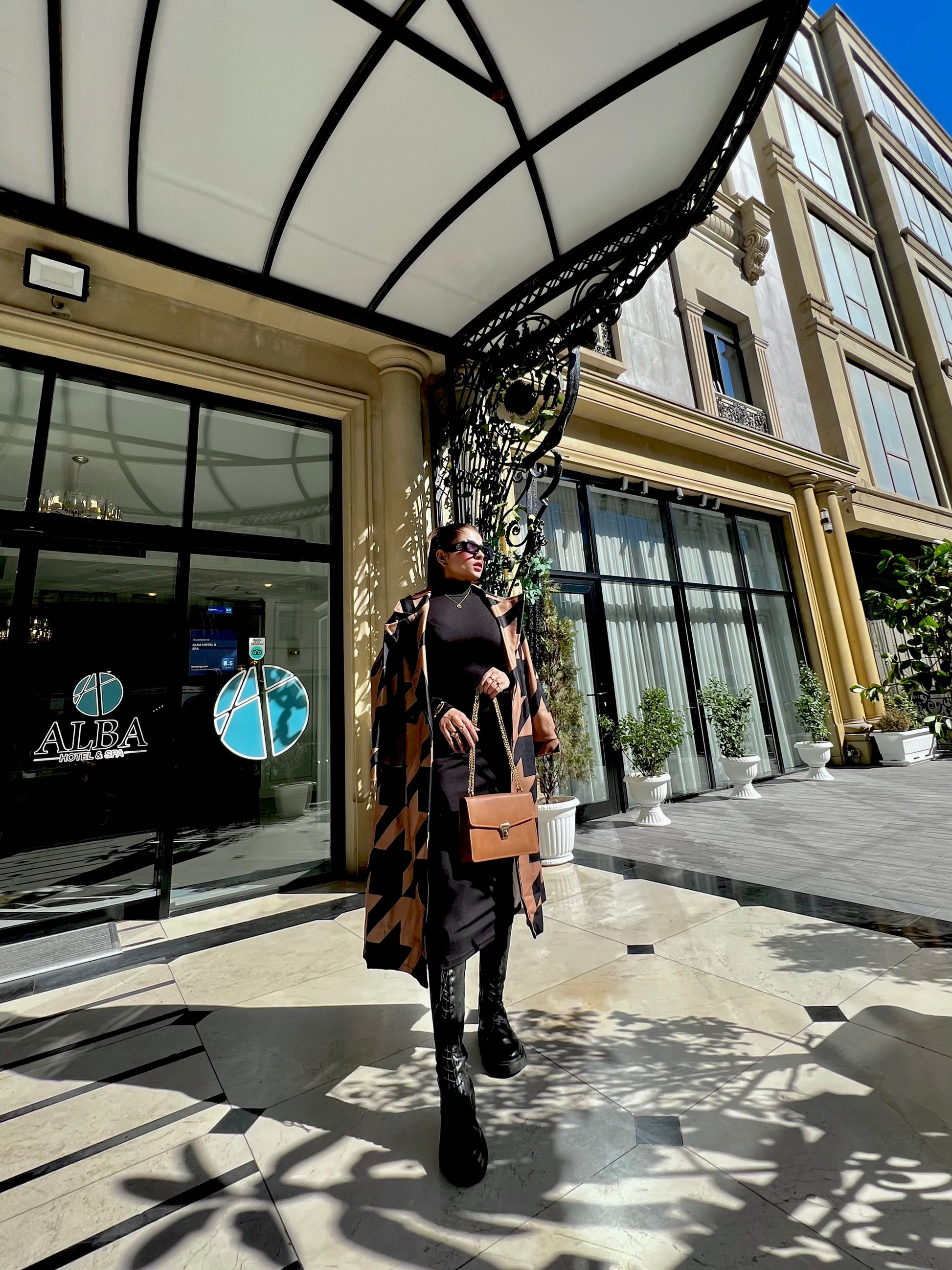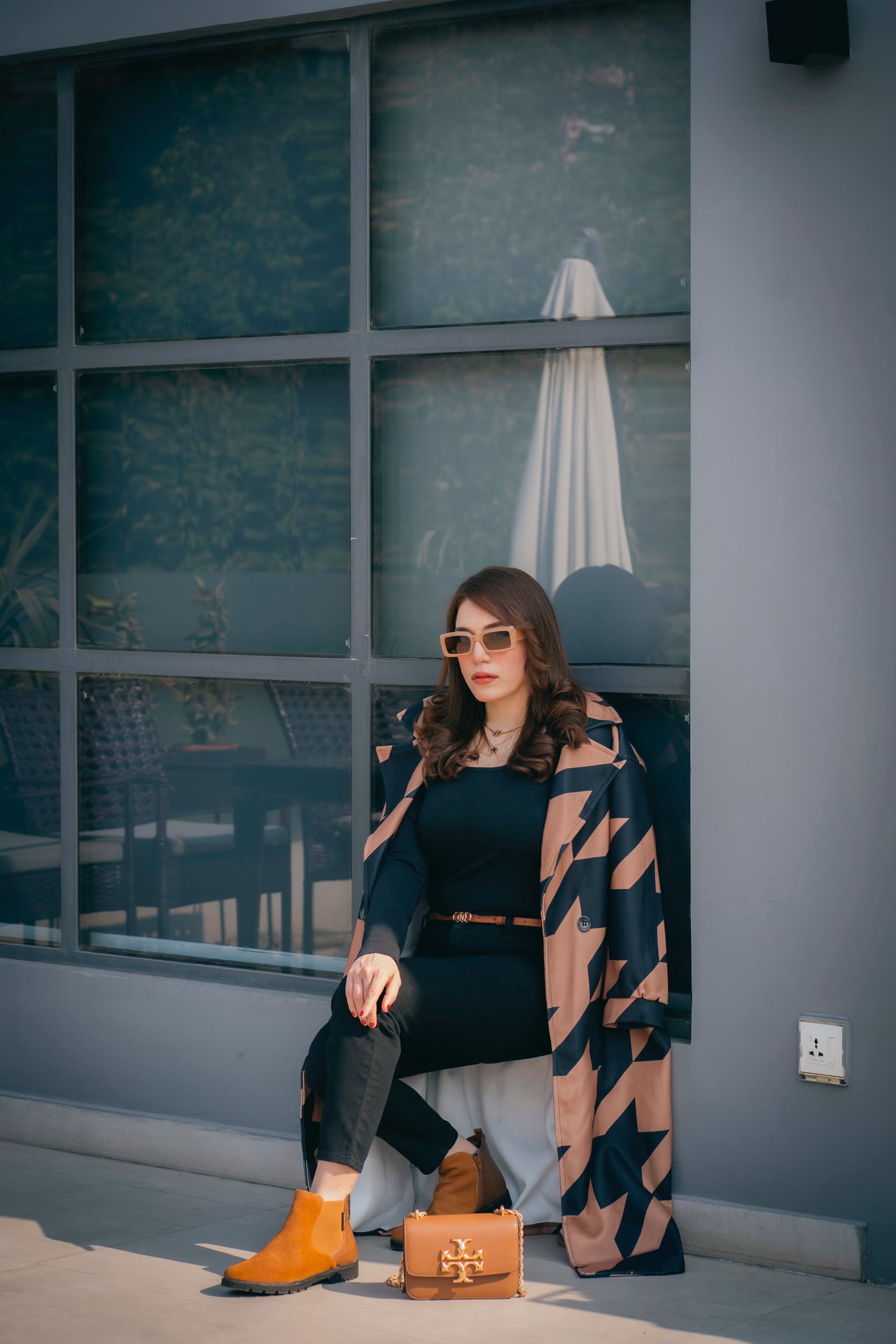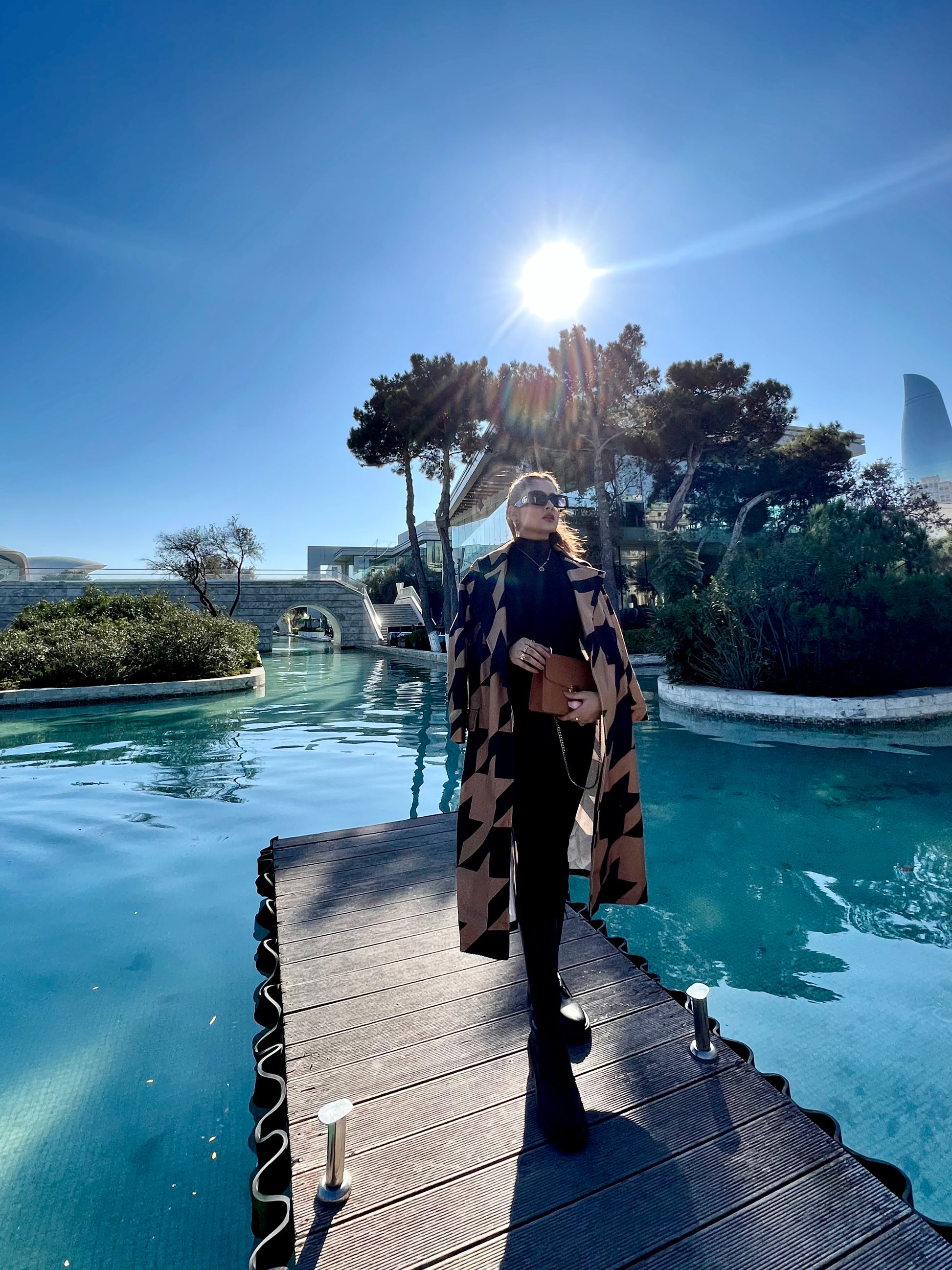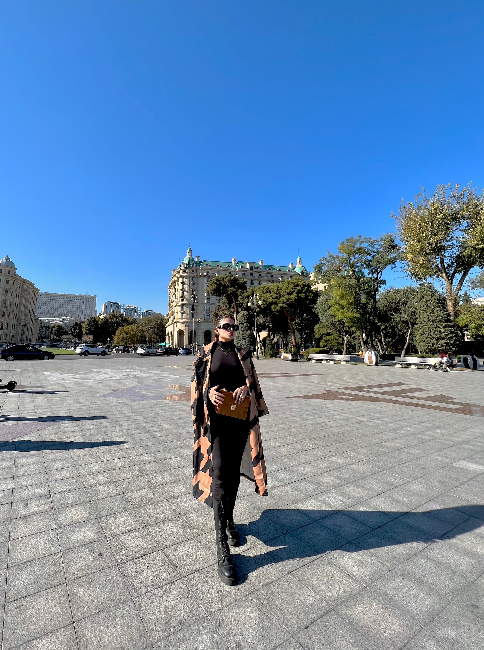CAMEL MID-CALF LENGTH COAT IN BLACK GEOMETRIC PATTERN Coat