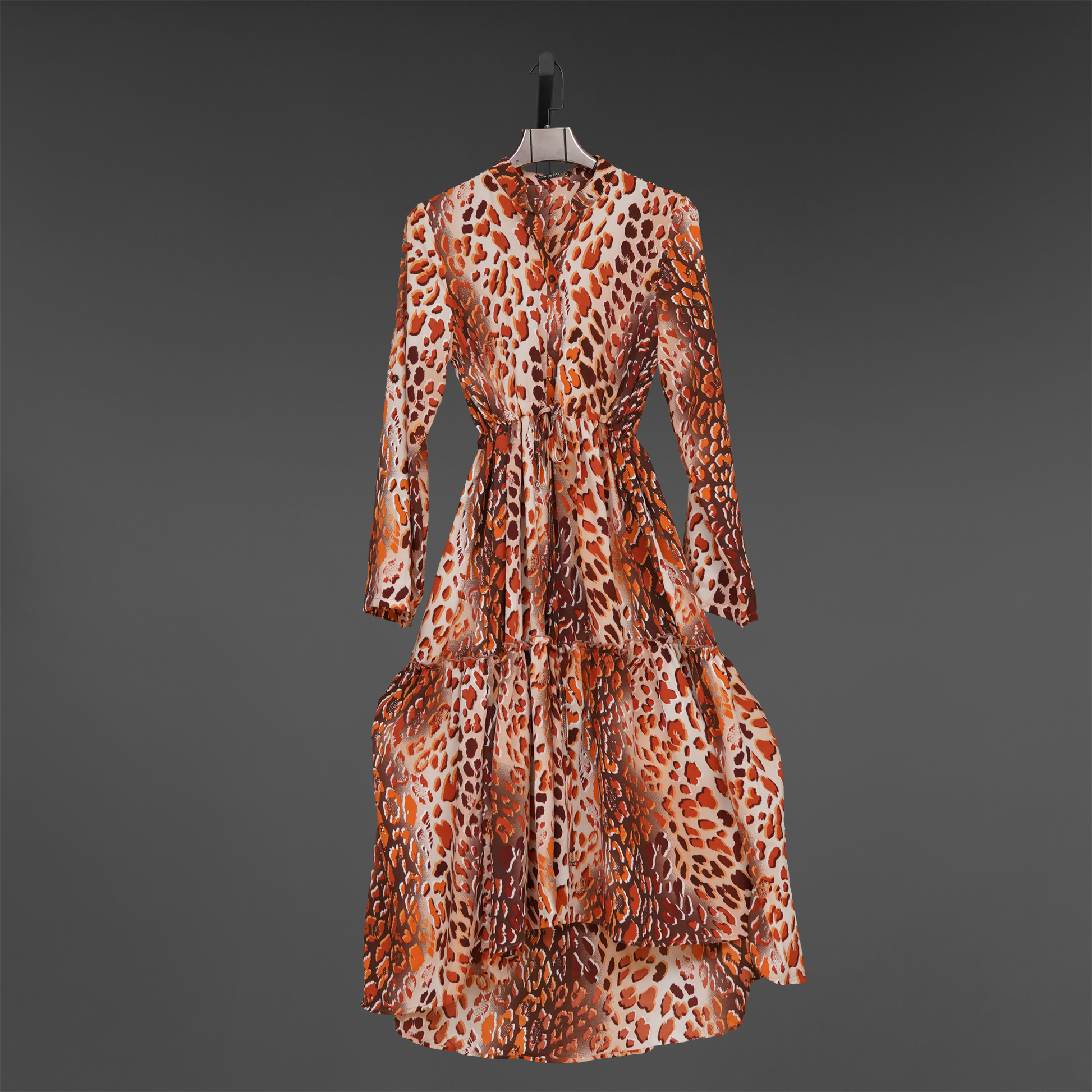 Presenting our "Charming Patterned Affair Dress" – a fusion of style and allure. This dress boasts a captivating printed pattern that adds an enchanting touch to the ensemble. The long sleeves exude sophistication, while the belted overall waist creates a flattering silhouette. The back tail detail adds a touch of whimsy, and the front button closure offers a classic appeal. Stitched flairs bring movement and grace to the design, completing the look with an air of elegance.